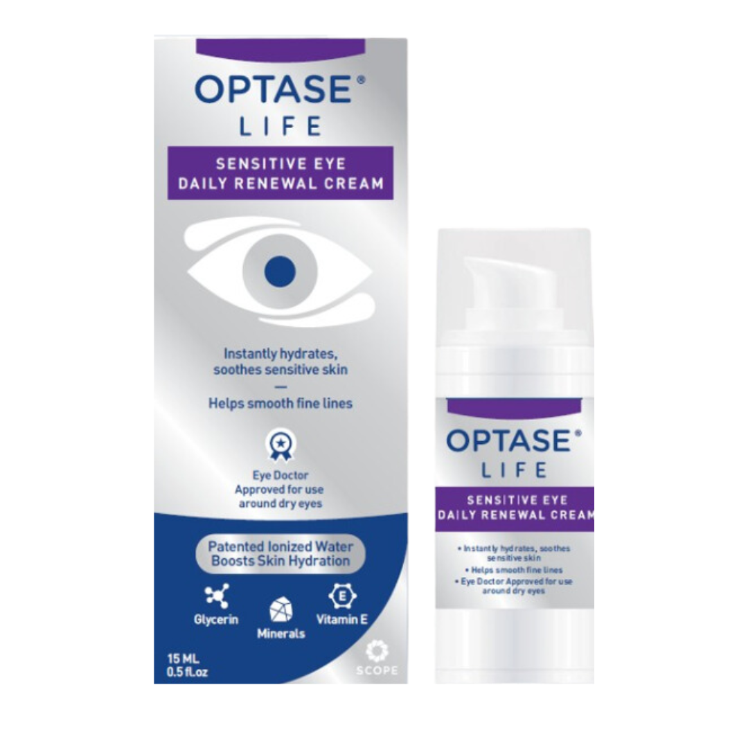 OPTASE® LIFE Sensitive Eye Daily Renewal Cream is a preservative free fast-acting hydrating eye cream that replenishes moisture to renew dull and sensitive skin around eyes. With daily use it helps smooth appearance of fine lines, protects against dryness and soothes the sensitive eye area. It was developed specifically for eyelid skin and eye contours and to respect the ocular surface. It contains patented ionized water technology to actively boost skin hydration, fortifying the skin’s natural protective barrier and replenishing essential skin lipids in the upper skin layer.